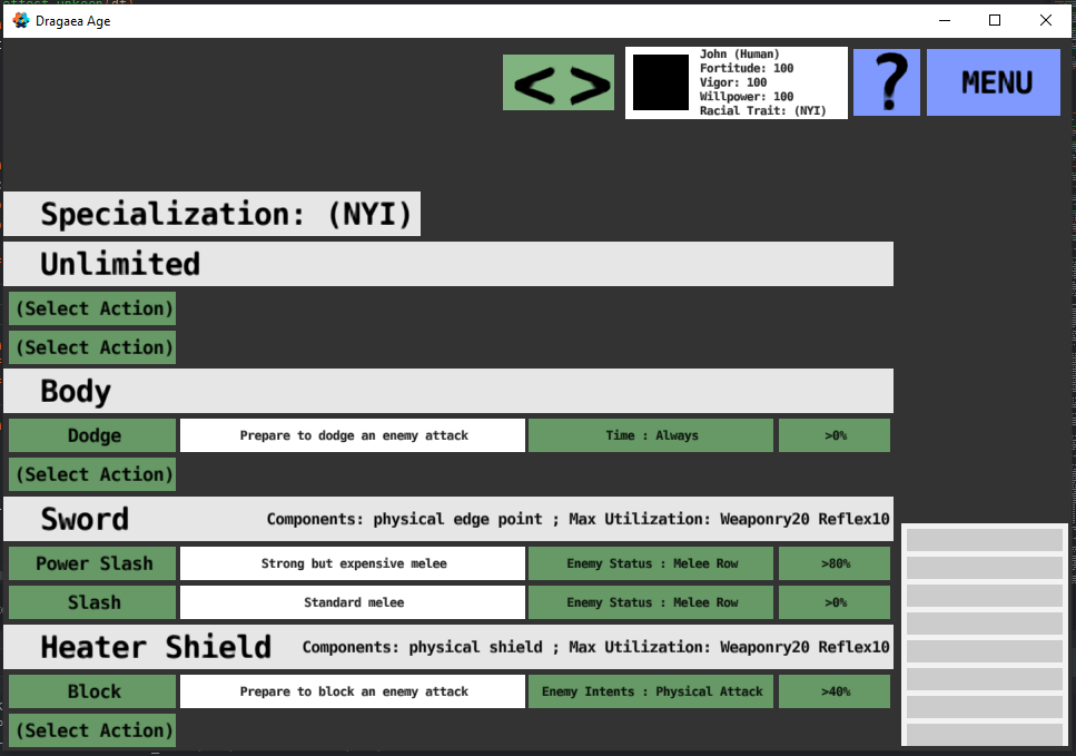 Final product will have a town layer for selecting equipment / skills, setting up Dragon Age: Origins style tactics for your party, etc. Full campaign and side quests, all unique and re-playable with various secrets. Dynamic status system that requires setting strategies against enemy movesets using conditional allied skill use. Art and UI is highly temporary.